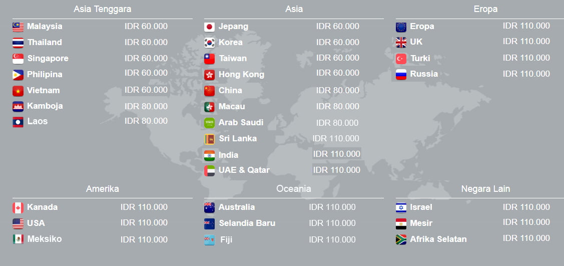 Perhitungan biaya penyewaan Modem Travel Wifi didasarkan pada banyaknya hari pemakaian (durasi lamanya), bukan banyaknya data yang di gunakan. Jadi perhitungan ini didasarkan pada lamanya Anda berada di luar negeri.Berikut ini adalah tabel harga sewa modem travel wifi DATA MIFI per hari di beberapa negara destinasi wisata yang populer (untuk harga sewa modem di negara yang tidak tercantum di bawah ini, silahkan menghubungi kami) :