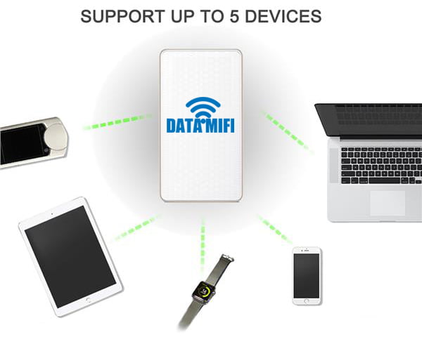 Anda dapat kongsi/share koneksi internet wifi dari modem DATA MIFI ini sampai dengan 5 buah device. Artinya Anda dapat mengkoneksikan smartphone, tablet, laptop Anda sampai batas 5 gadget sekaligus dalam waktu bersamaan. Atau jika tidak, Anda juga dapat sharing koneksi internet wifi dengan teman seperjalanan Anda.Namun apabila sharing wifi dilakukan antar teman, tentunya Anda mesti selalu berada berdekatan dengan teman Anda agar semuanya dapat selalu mendapatkan sinyal wifi dari modem ke gadget masing masing.